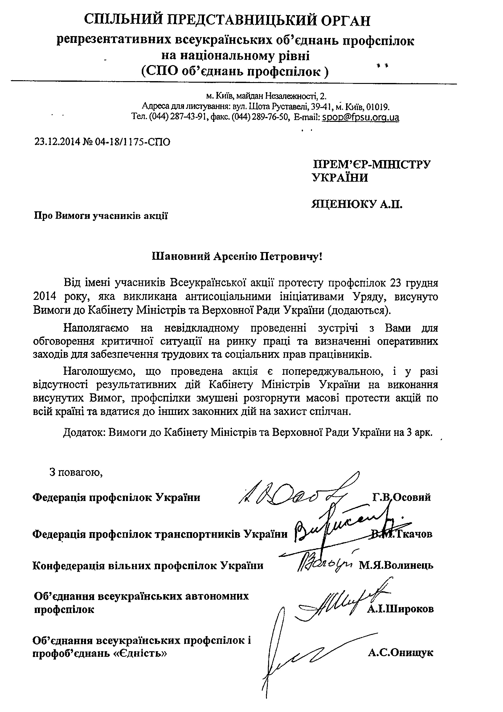 Учасники Акції протесту профспілок – представники усіх галузей економіки зазначили, що глибоко обурені антисоціальними планами Уряду що трансформуються у «безстрокову шокову терапію» для українців. Вони зазначили, що вже сьогодні державні соціальні гарантії – мінімальна зарплата та мінімальна пенсія – становлять менше 80 доларів і не дотягують до визначеного ООН рівня злиденності – 5 доларів на день. Така державна політика відносить українців до групи найбідніших народів світу.